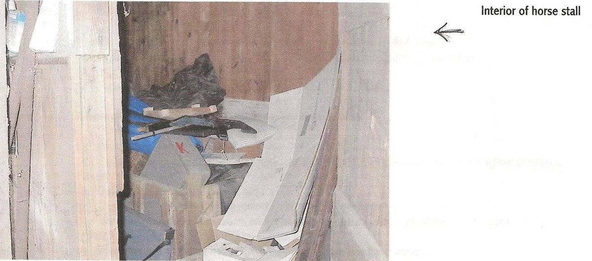 This is a 1 1/2-story, tripartite carriage barn. The main facade faces northeast and the ridge-line of the shed is perpendicular to this portion of Quaker Farms road, which runs northeast-southwest. The main entries are two open bays in the middle and north bay of the northeast eave-facade. The openings are beveled at the top and have trim. The west bay has pass-through door by the west corner and a six-pane window towards the middle bay. The southeast gable-end of the carriage barn has a centered side-hinged hay door with wrought iron blacksmithed hardware. The rest of the gable-end is blank. The grade declines to the west, revealing an um-mortared foundation. The southwest eave-side of the carriage barn has a pass-through door at the south corner. The shed has vertical siding on the eave-sides and horizontal siding on the gable-ends. The roof is partially covered with a tarp and has wood shingles on the visible portion. The foundation is un-mortared field-stone.