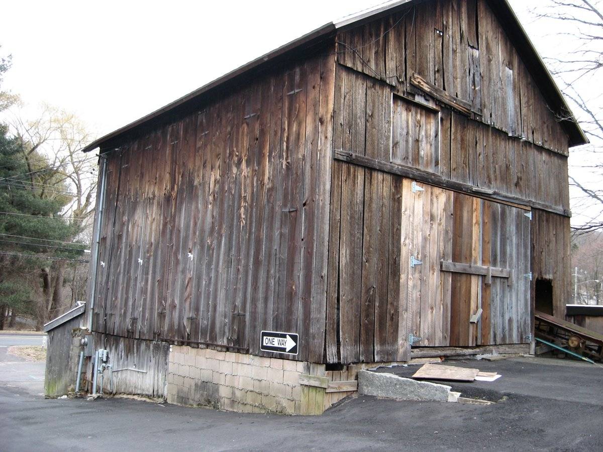 This is a 1 ½ story gable-entry bank barn with its eastern gable-side facing Main Street. The western gable-façade of the barn facing the farm was probably the original main façade of the barn with the main entrance at the center. The main entrance on the façade was probably through a pair of exterior-hung hooded sliding wagon doors which have been later converted to a pair of double-height hinged wagon doors. The hood of the main entrance forms a continuous trim on the façade. The grade level along the façade drops on either side of the main entrance which continues to form the bank along the southern eave-side and the eastern gable-side. The western gable-façade has a second entrance towards the south, accessed from the lower grade level by a wooden ramp. A boarded window can be seen towards the north on the façade, flanked in between the horizontal trim below and a distinct dropped girt siding divide line above separating the gable attic. The southern eave-façade of the barn has hinged vertical siding at the first floor level and a semi-open shed-roofed addition at the bank level. The façade has an entrance through a pair of hinged doors towards the east to access the bank level. The façade also appears to have a window and a second pass-through entrance towards the west at the bank level. The western gable-façade of the barn facing Main street is the present main façade displaying the name of the barn ‘The Old Cider Mill’ towards the south, just above the bank level. A metal saddle can be seen on the façade off-centered towards the north of the signage. The façade has a semi-open shed-roofed addition at the bank level and appears to have two pairs of alternate doors and windows towards the east, which seem to be later additions. The northern eave-façade of the barn is blank with a distinct siding divide line at the first floor level, separating the bank below. The bank has vertical siding towards the east and concrete block masonry towards the west. The grade level along the façade gradually rises towards the west.