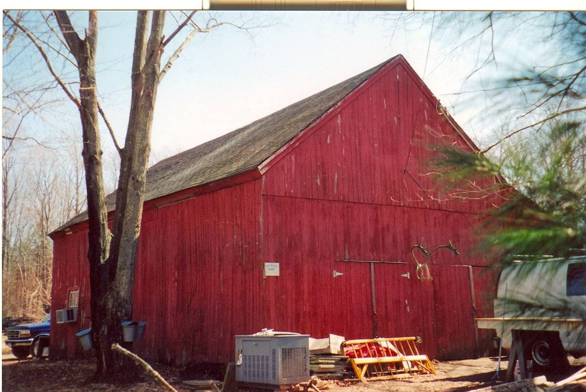 The barn has vertical flush-boards painted red with white trim. The roof is covered with asphalt shingles and a metal chimney is located off-center towards the west on the south plane of the roof, suggesting use as a heated workspace.