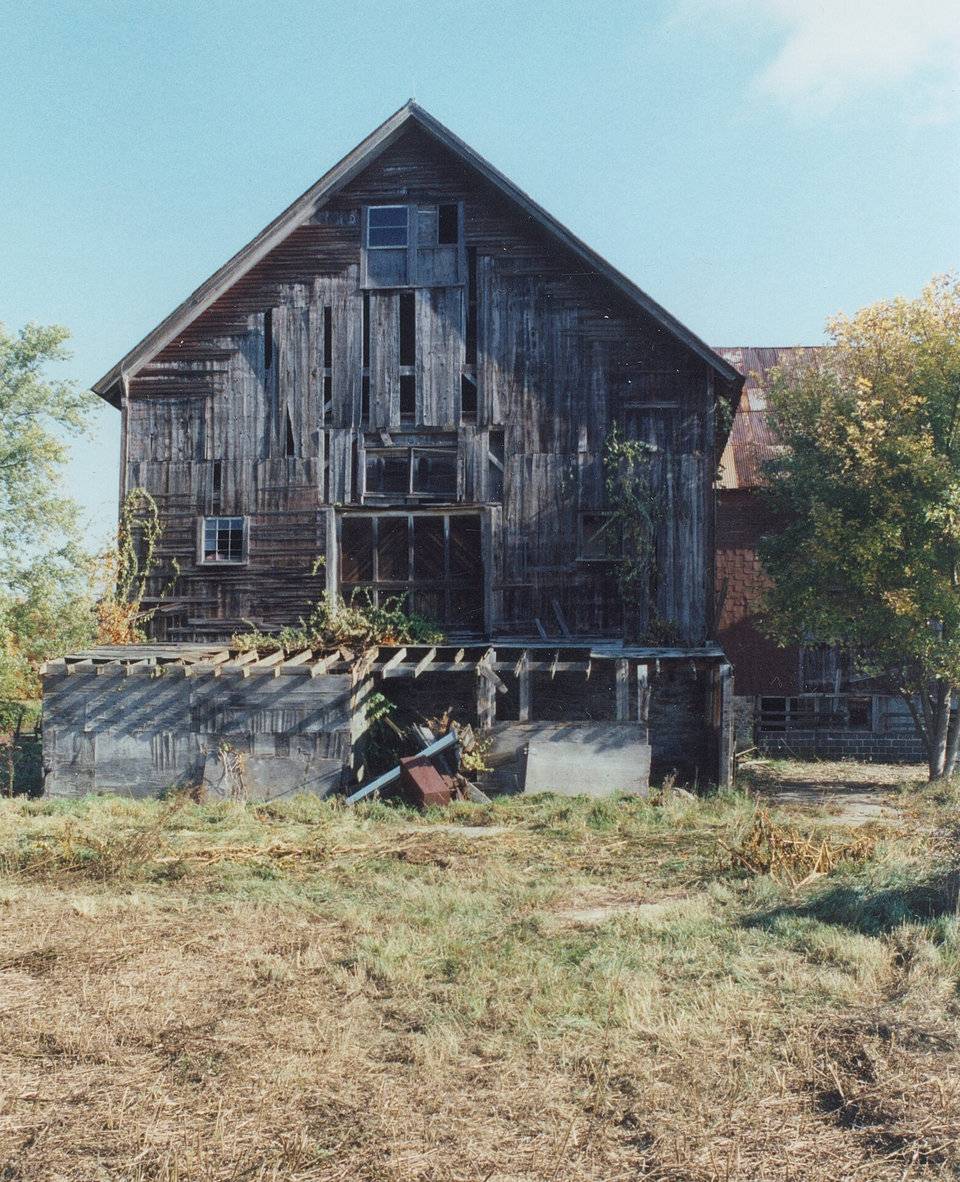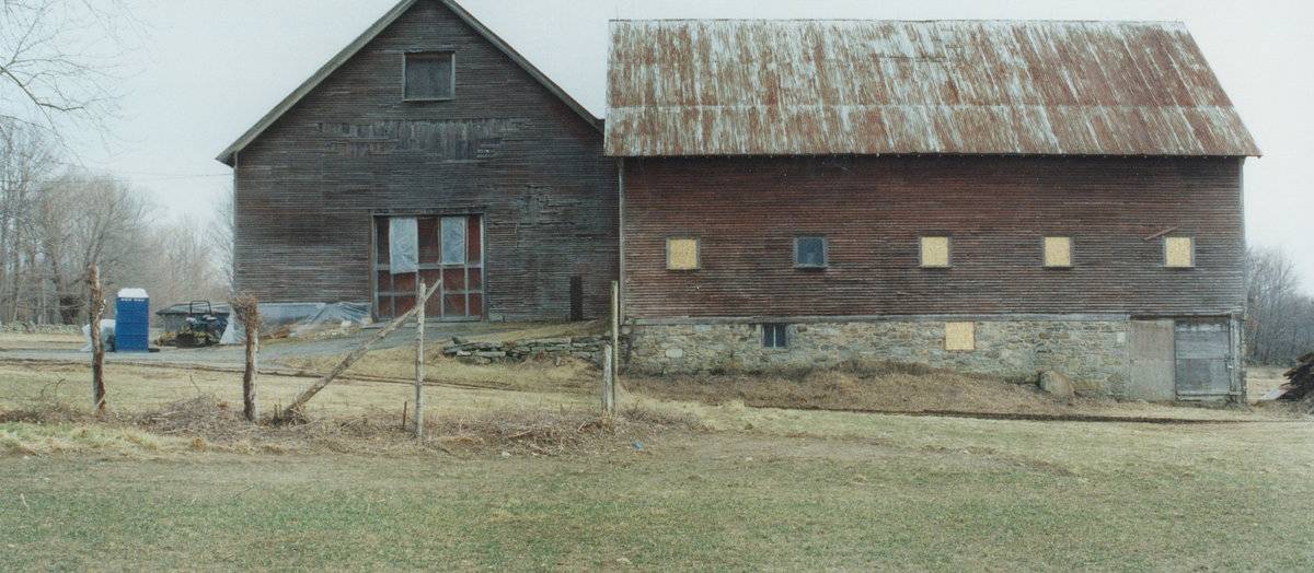 This is a 1 ½-story gable-roofed bank barn with its ridge-line oriented north-south, abutting the corner of Barn I. The north gable-end has its main entry at the upper grade level, a tall barn door opening with a pair of interior sliding doors matching Barn I. Above in the attic peak is a pair of six-over-six double hung windows. The west eave-side has several courses of exposed fieldstone foundation as the grade declines toward the south. There are two basement windows. In the main level there are five six-pane stable windows. Photos of “before” conditions show that the south gable end was formerly a bank barn, but grading has been altered to provide a ramp to the south doors from the main level. The doors, matching the other gable-ends, are flanked by a stable window on each side. A matching pair of double hung windows sits in the peak of the attic. The east eave-side has an exposed basement level similar to Barn I’s south side, and a row of five stable windows in the main level.