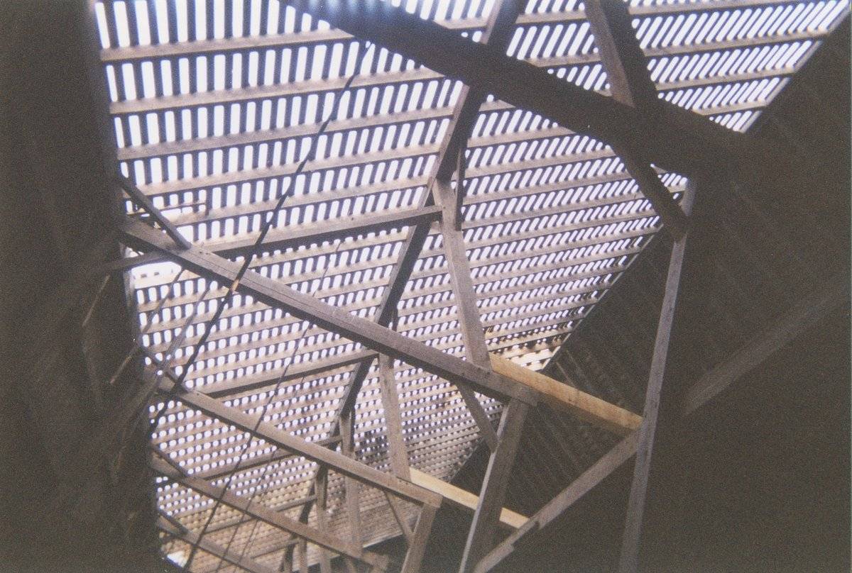 Silos are held together with adjustable steel hoops, spaced about fifteen inches apart. Since concrete does not expand and contract with changes in moisture levels, the hoops on concrete stave silos were usually tightened only once after the structure was built. inside, these silos are coated with a cement wash.